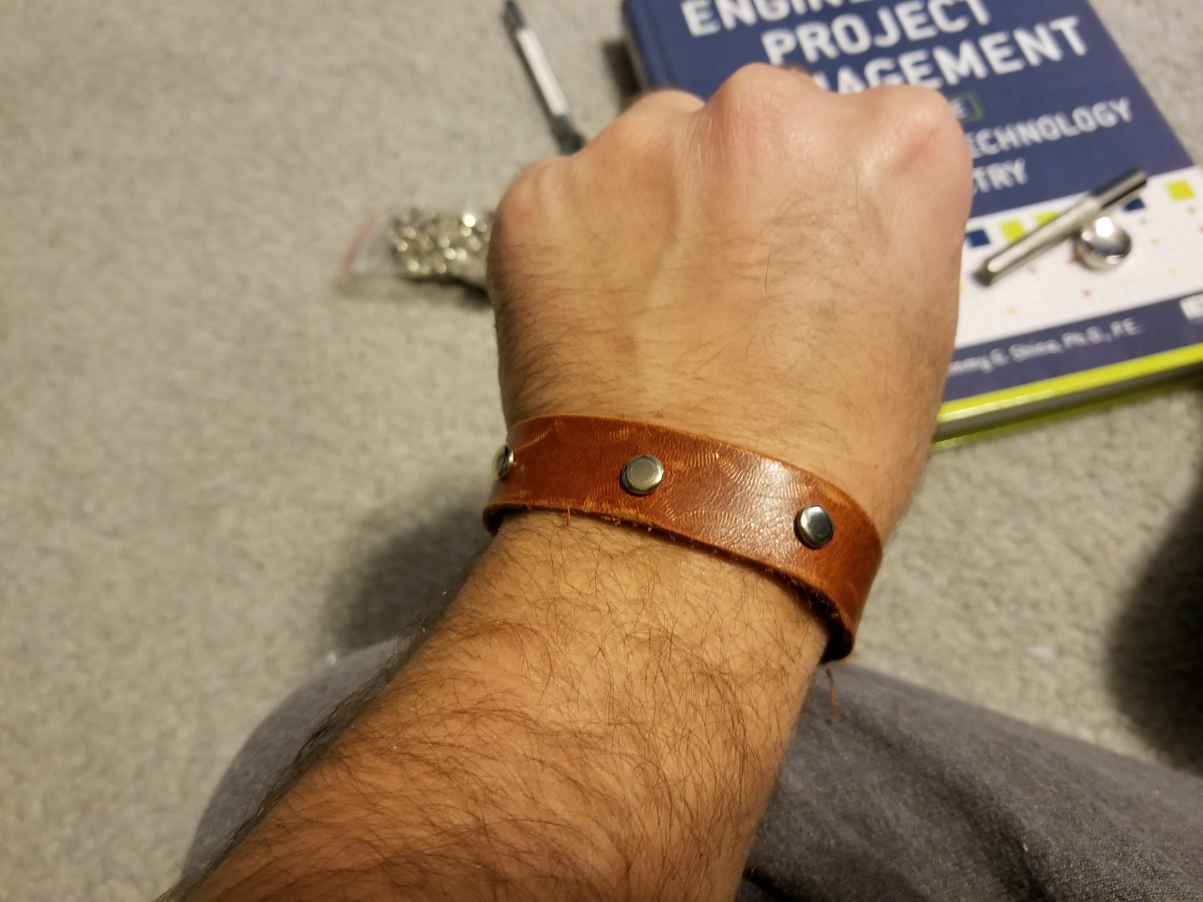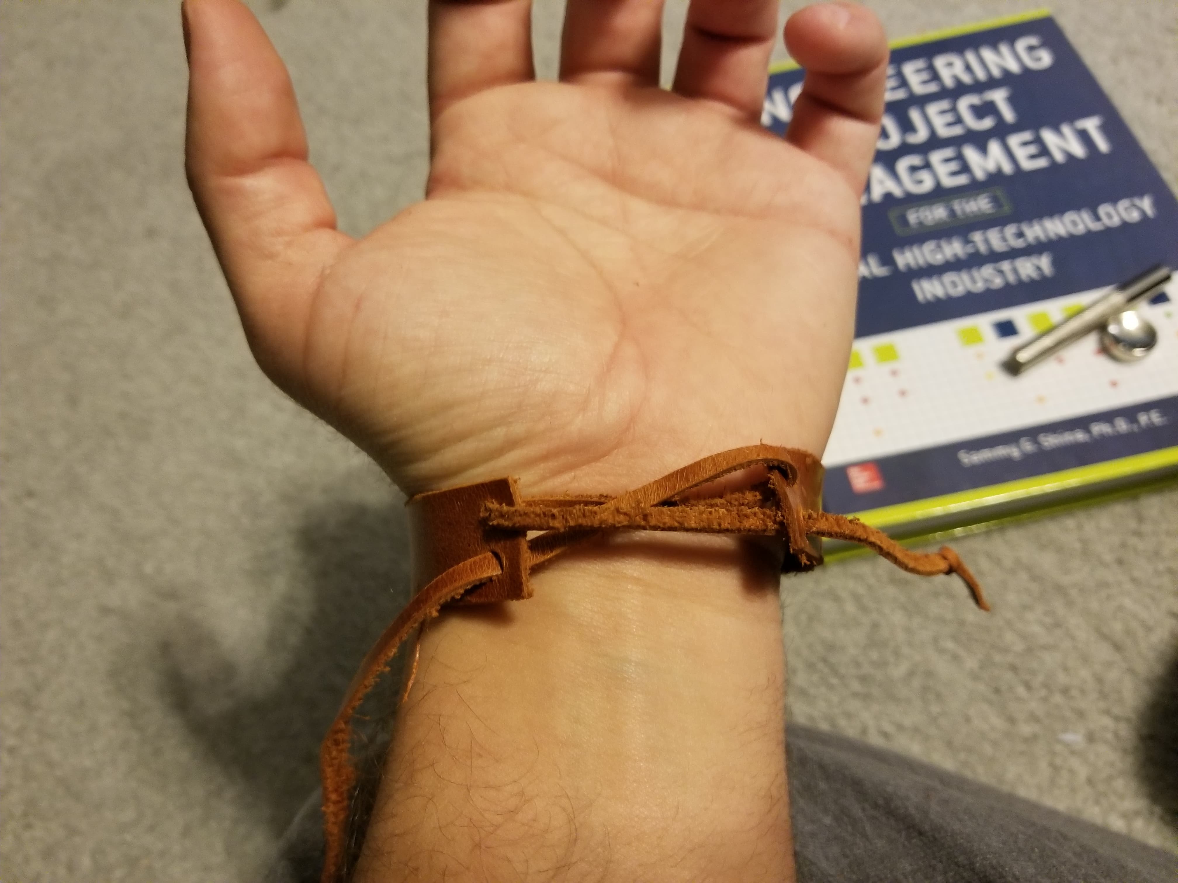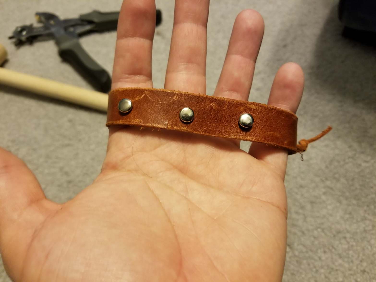 The first project was the small bracelet I made (see pictures below). The leather came from a scrap leather bag from the craft store Micheal’s. I added a quick stamp around the border that didn’t imprint really well, and 3 rivets. To tie off the bracelet to someone’s wrist, I just cut thin pieces of leather. It works well for a small bracelet, but I tried that same thin leather rope method for other projects and they didn’t work out well.