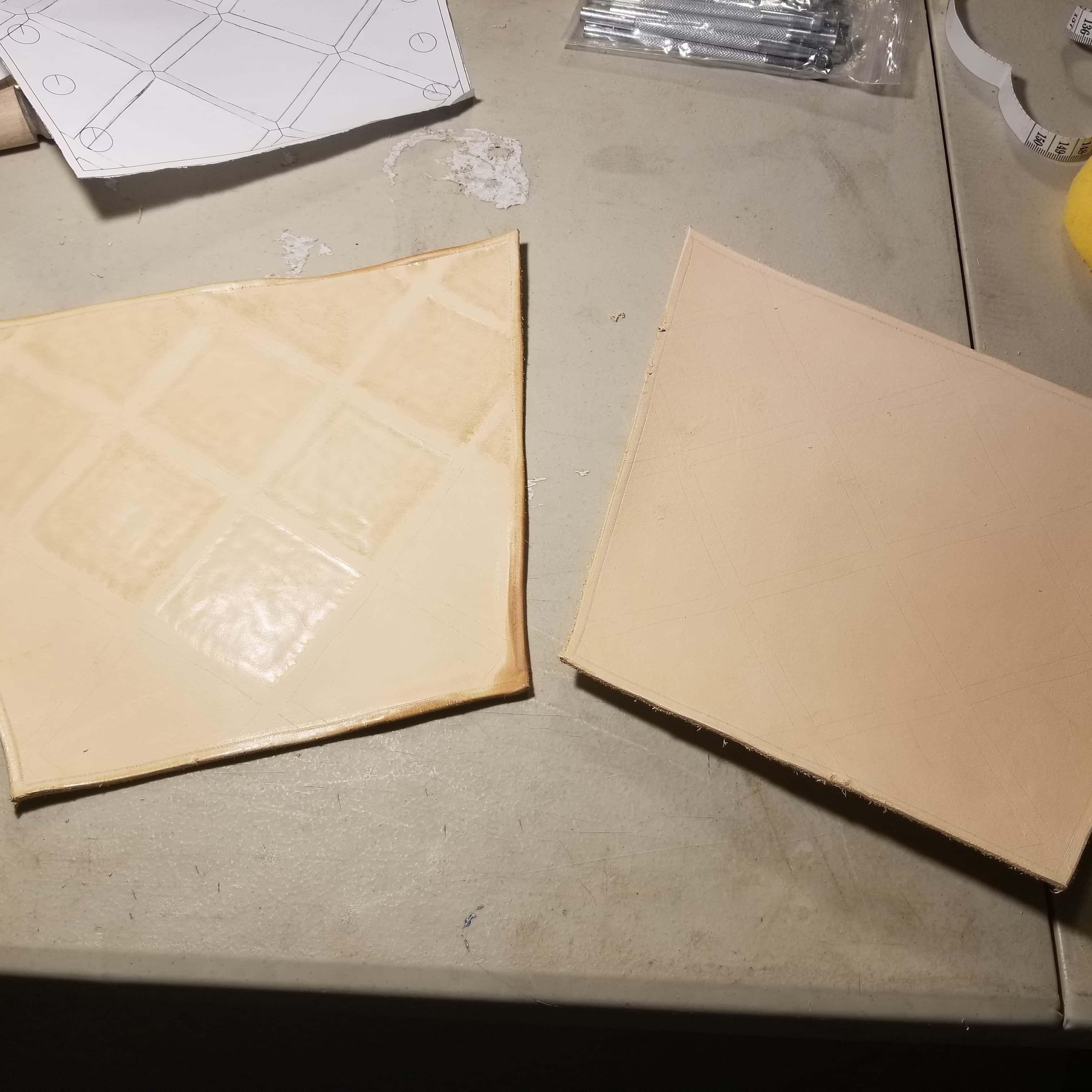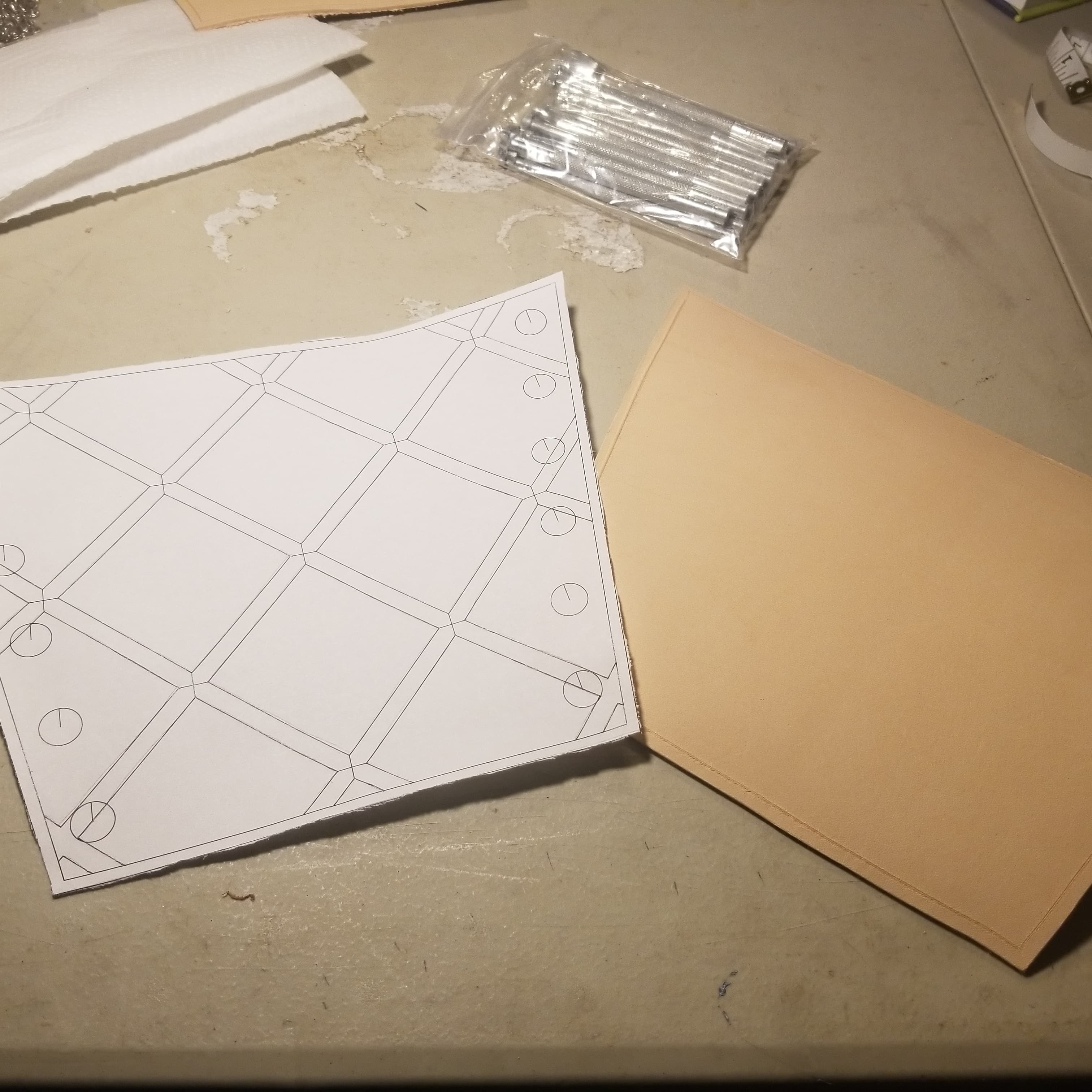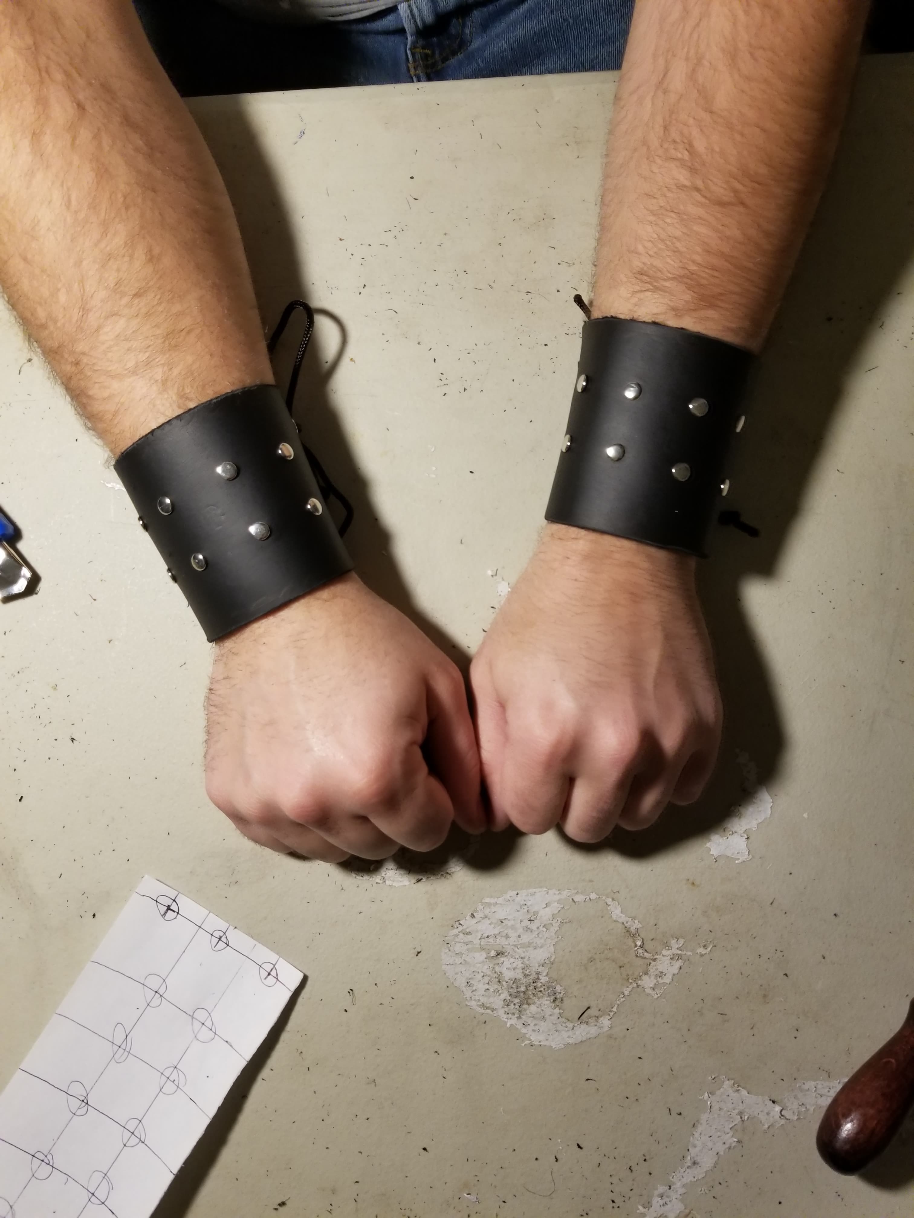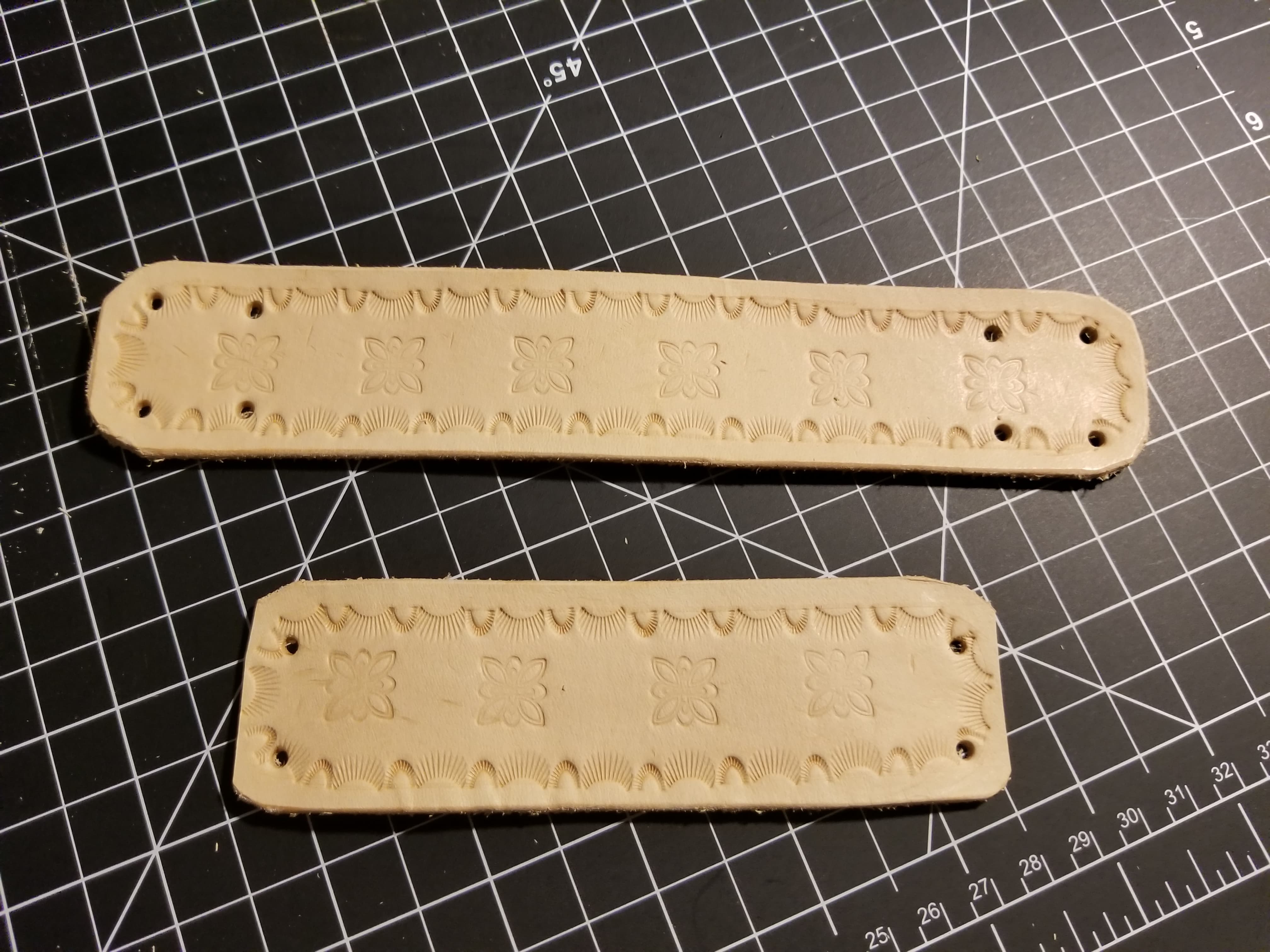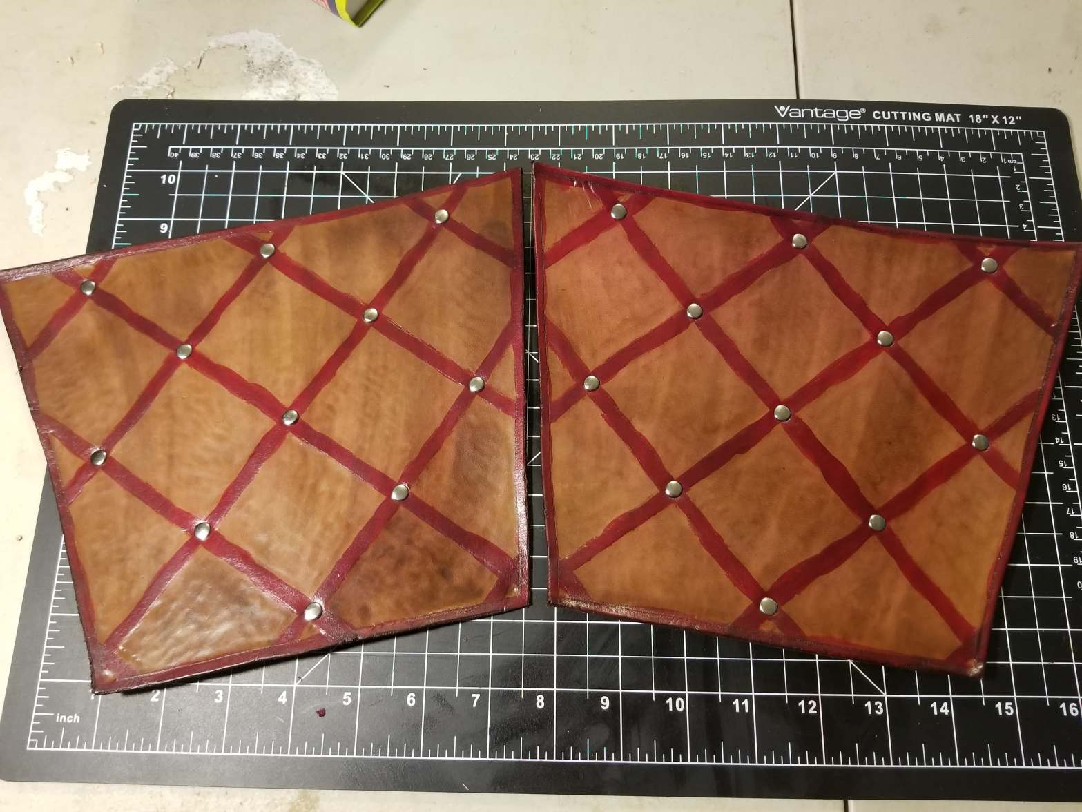Now, a project that I am still working on. Bracers. This one, I tried to be a little more diligent when making them. I drew up a pattern on the computer, figured out exactly where I want my rivets and eyelets rather than just eyeballing them afterward. I imprinted stamping to create the subtle 3D look to create the strips rather than cut them out and glue them on. This took a lot of effort. I’m in the process of dying them now, hopefully they will be finished by the end of next week. I’m waiting for some red dye to be delivered.