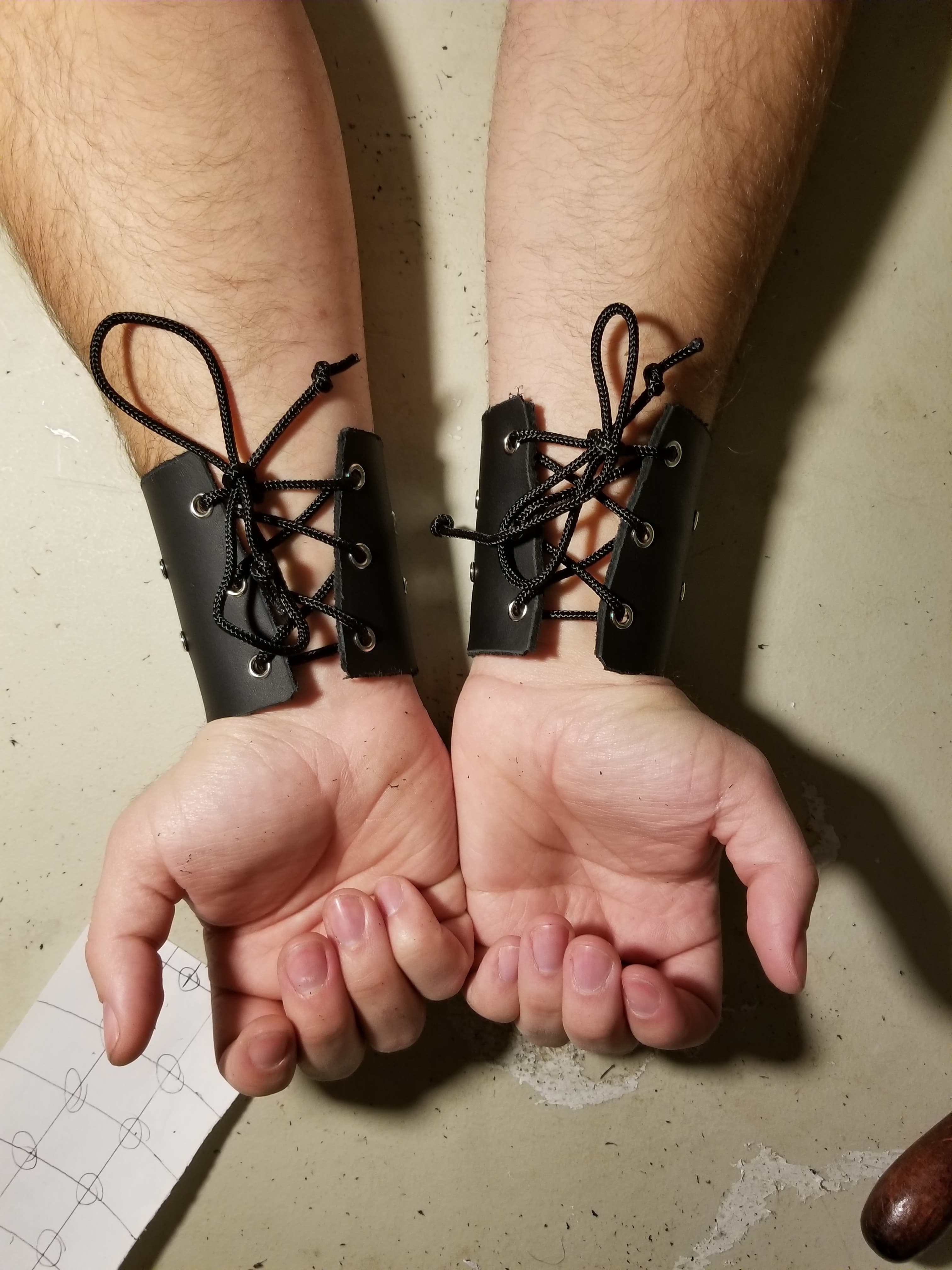 The second project I completed were a pair of black cuffs. I essentially like my bracelet and wanted to take that to the next step. I actually drew up a pattern on paper for this one. Once again, I used some scrap leather from a bag from the craft store Michael’s. I attempted to add some stamps around the border and in the middle, but they are very hard to see, they don’t even show up in photos! Like before, I tried used thin leather as rope, and it did not work well at all. It wouldn’t tighten around my wrists like I wanted. So I went out and bought some eyelets and paracord as the rope for tightening. In my opinion it works perfectly, exactly how I wanted it to.