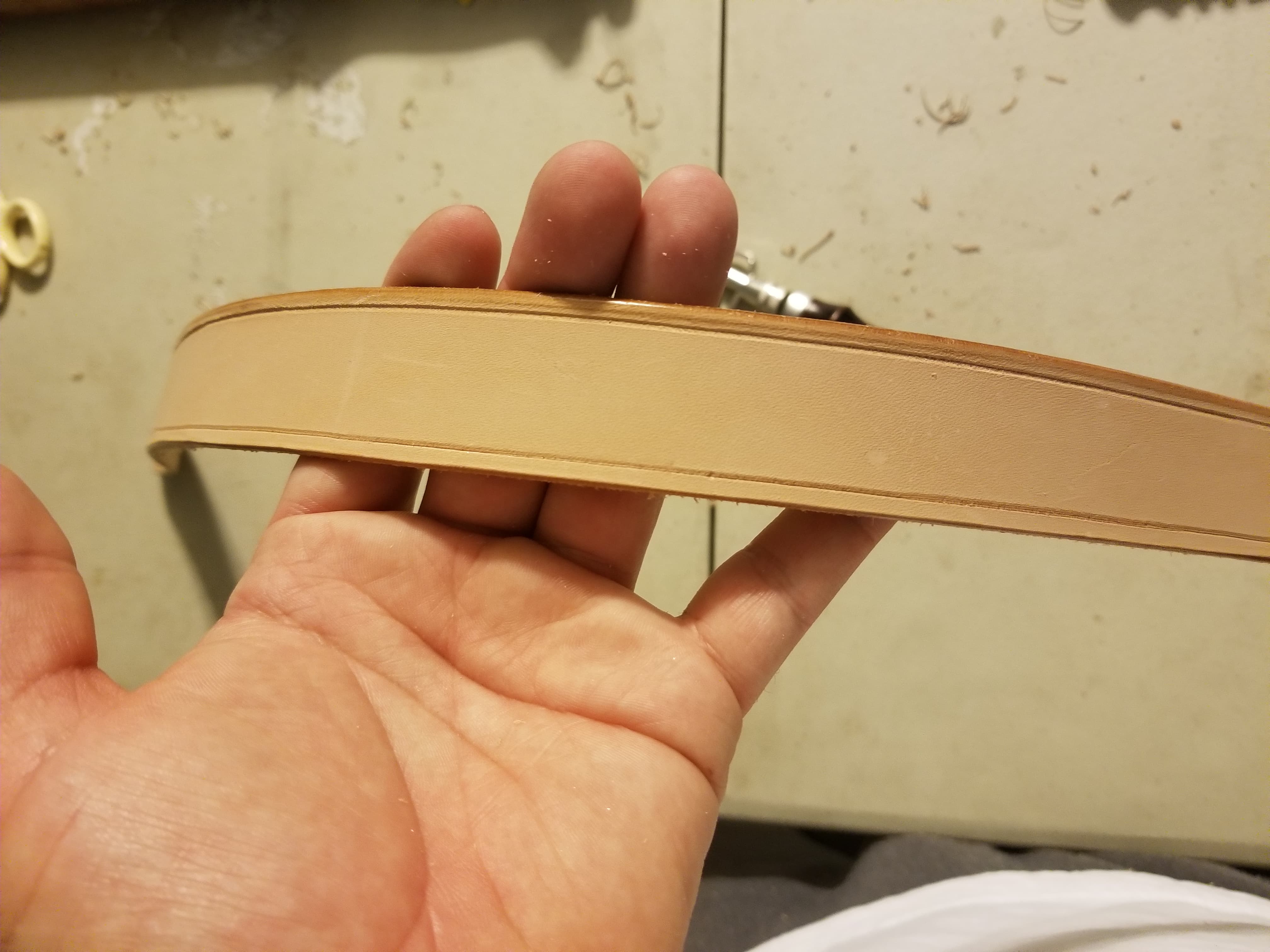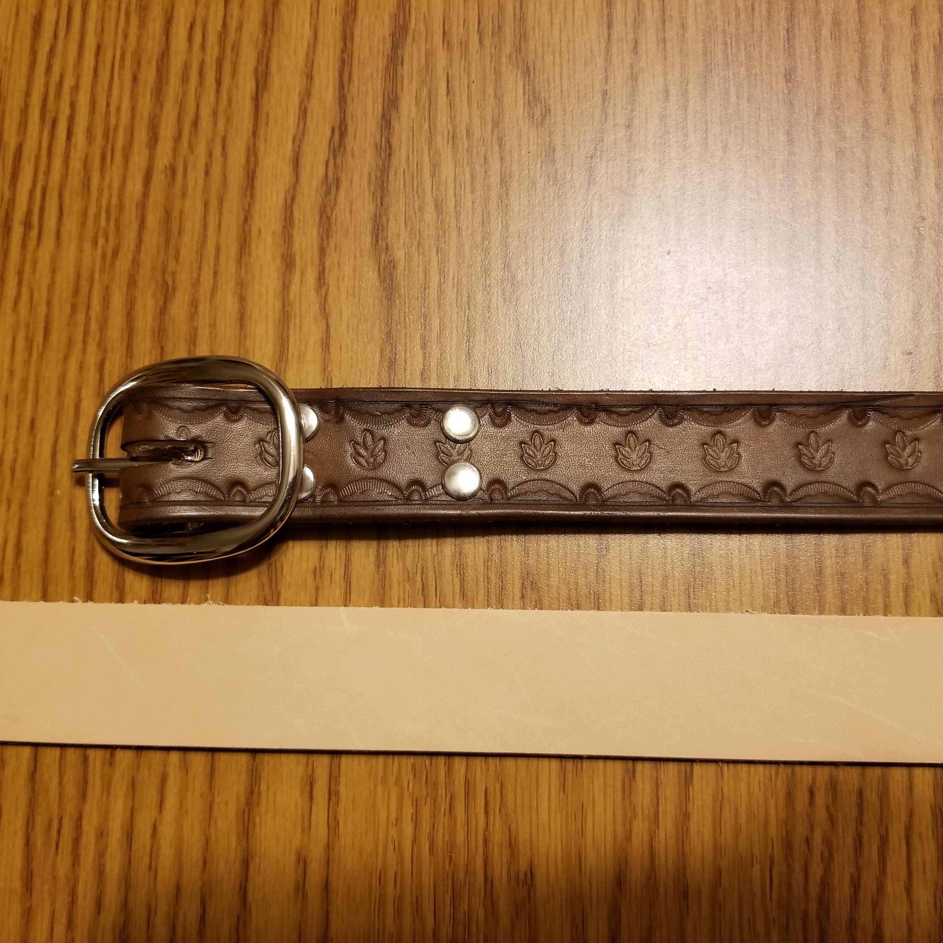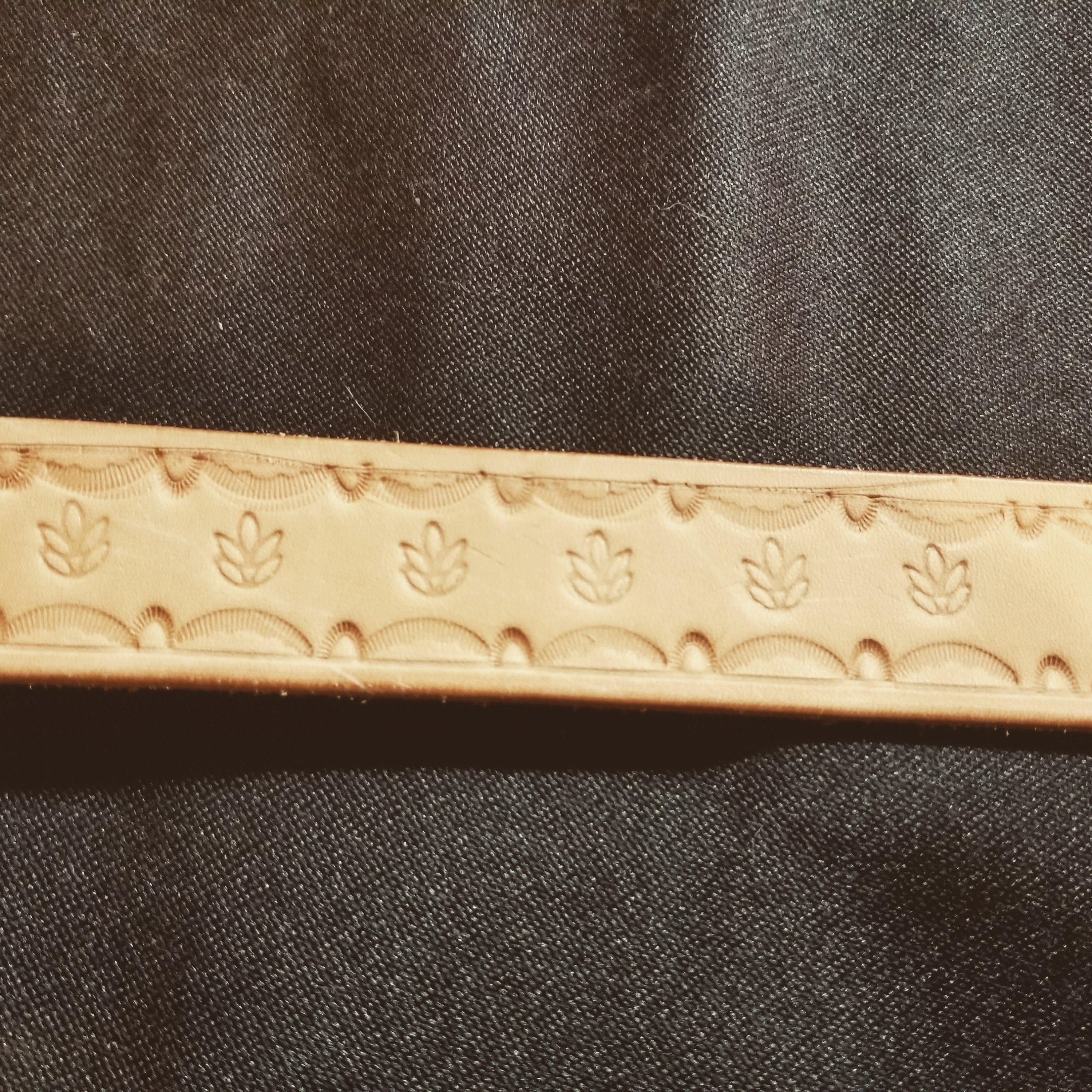 My third project, which is also kind of my first is the belt I made. I’ve been working on it since before the bracelet but it took me much longer to finish. First thing I did was cut off the end to match the length of a belt I already owned and used quite regularly. I then wet the leather and stamped the entire border around it over a couple days. After that was done, I needed to cut out an oblong piece for the buckle to fit into, and then dye it. I only died the front, but I should’ve dyed the backside too. I then bought some leather sheen finish to protect it. And this, it was done!