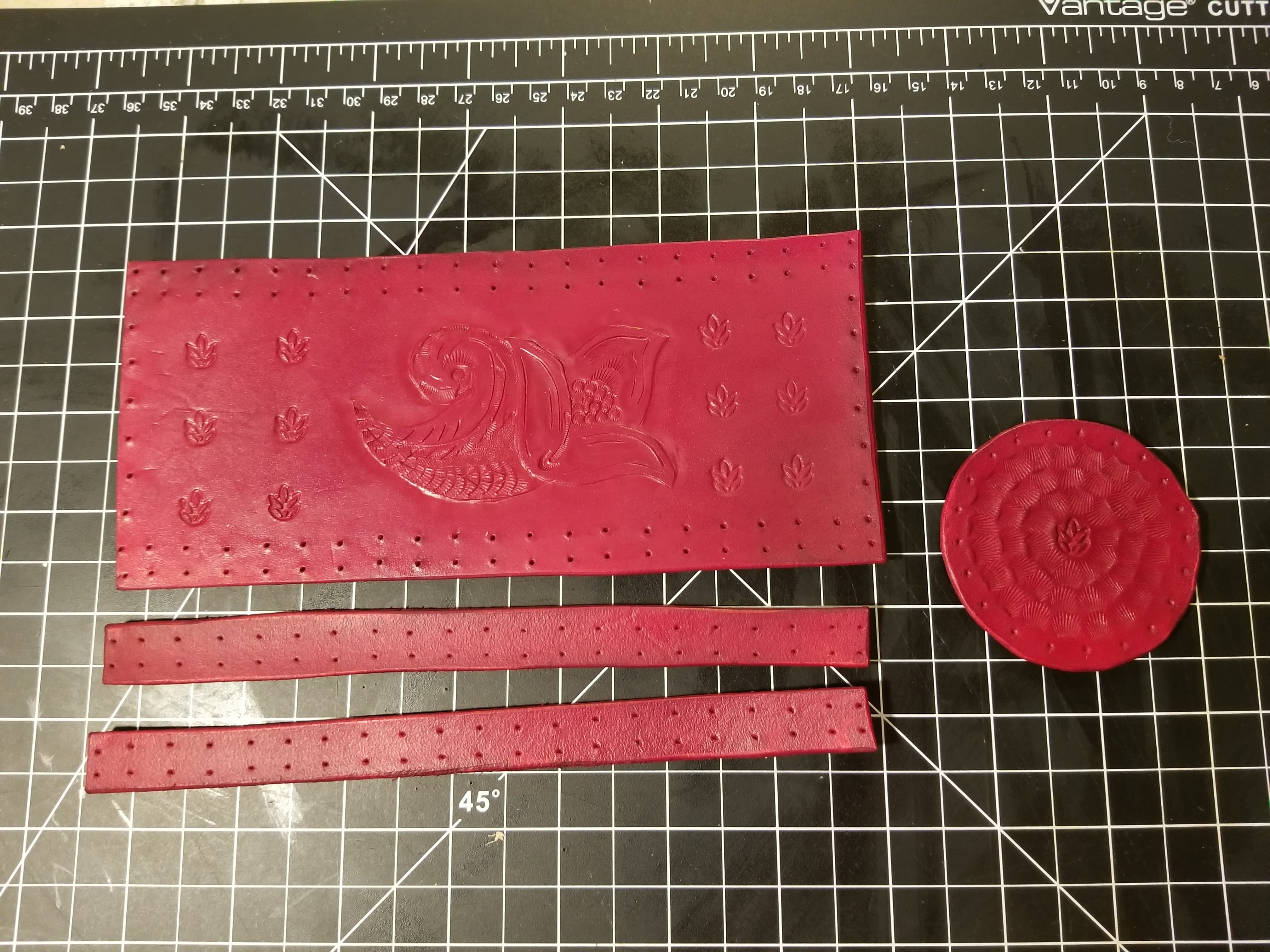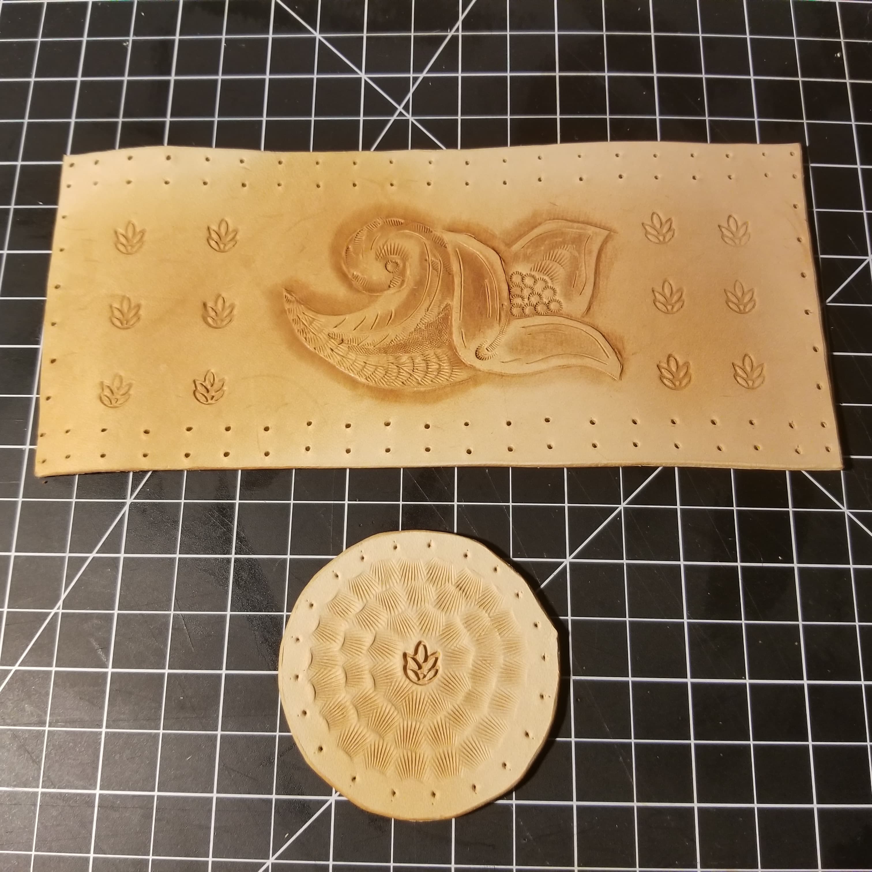 And now, my latest project. A holster. The holster could be used to just about anything, but I am designing it to at least hold a hatchet for when I go camping. It is very simple, the longer piece to slip onto a belt, and a smaller circle piece to just slide the handle of a hatchet or anything into. I once again added a border with stamps, which I kind of love doing now. Punch out holes where I plan to put my rivets. All I need to do is dye it, though I am unsure which color to dye it now that my dark brown is gone. And snap in the rivets and it’ll be done!